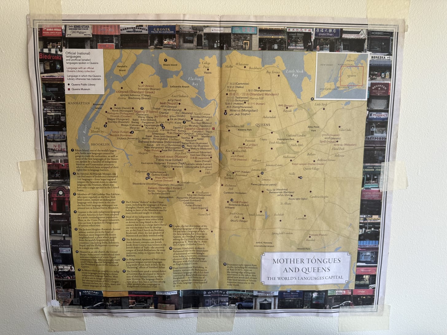 And this is a map of languages spoken in Queens, NYC, created by the Endangered Language Alliance. I encountered it around the time that I was gathering the words for “I live here” in as many of the languages spoken in Queens as possible, in written and video form. I keep the map above my desk.