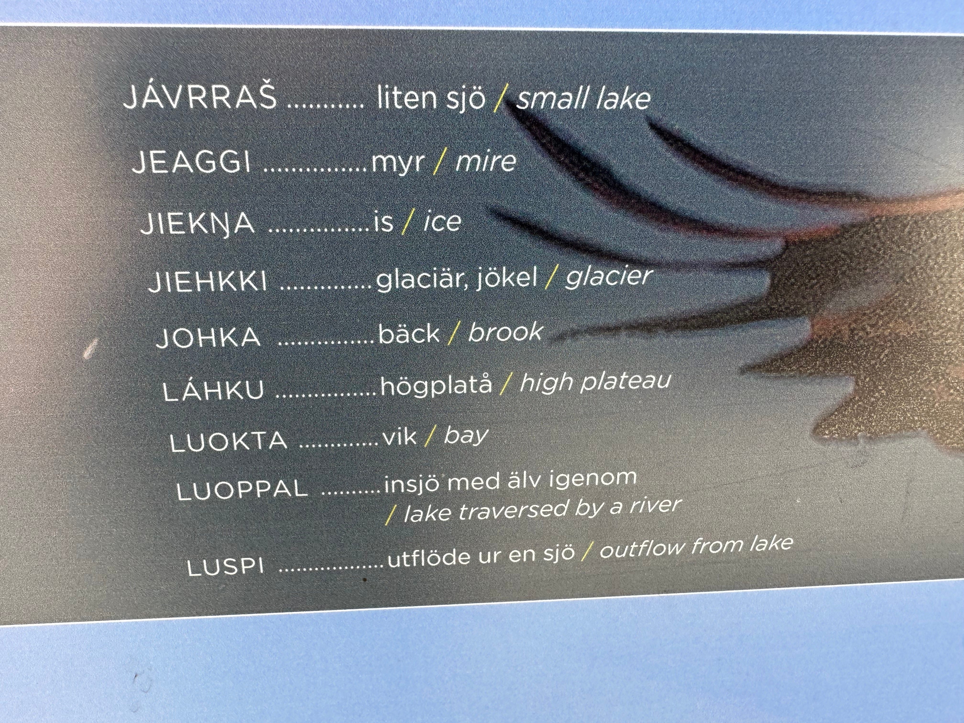 The photo below is of a board in Abisko National Park in Northern Sweden. It provides the words for certain landscape features in Jukkasjärvi Sami, in Swedish, and in English. The meaning contained in each is not exactly the same: translation is always the best possible bridging between meanings.