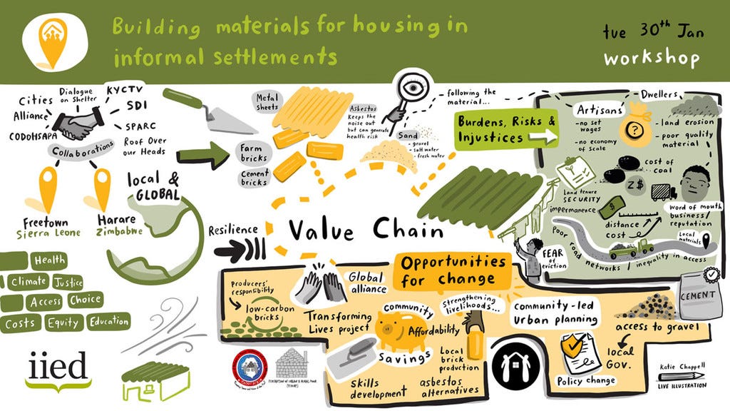 IIED is rocking it with research on housing and resilience, working with local partners. A recent long-read shares the results of research on the supply chains of building materials used by residents of informal settlements in Harare, Zimbabwe, and in Freetown, Sierra Leone.