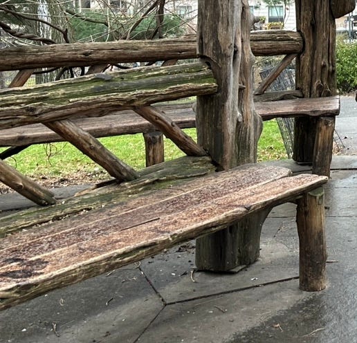 A bench is a simple example of the material world facilitating our emotional and spiritual worlds.