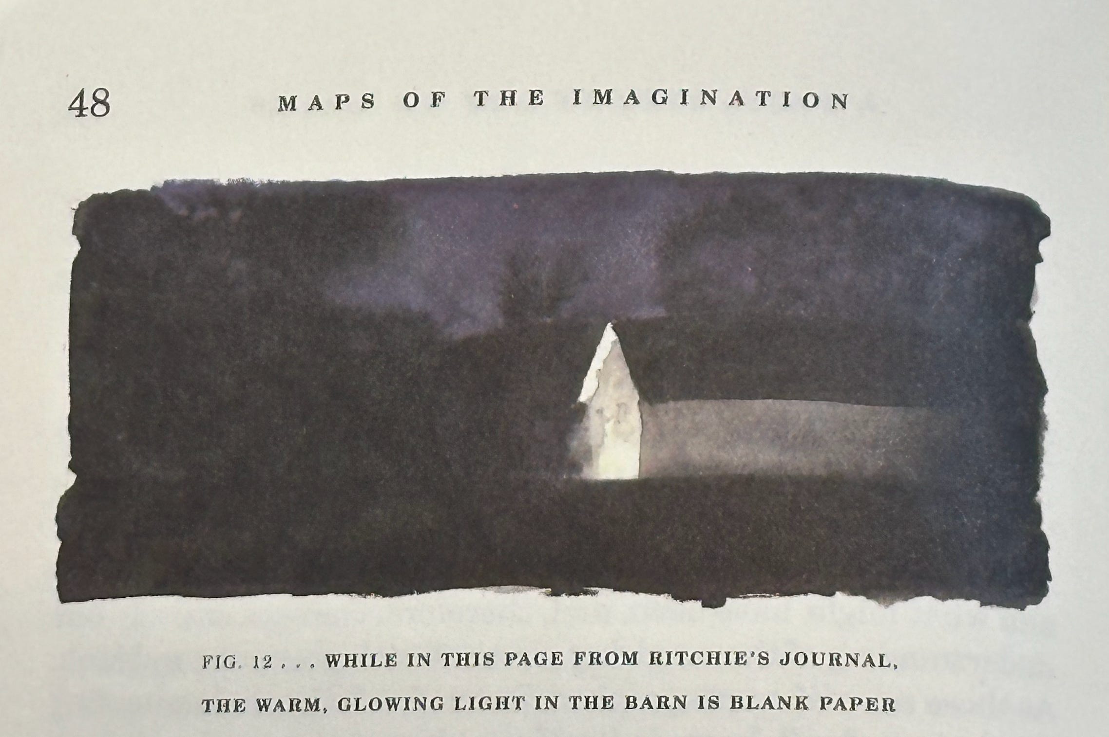 The image above is included in the chapter “A wide landscape of snows”. The chapter explores the ways that what is left out of a story or piece of writing, and what is left out of a map, plays a significant role in creating its meaning. It’s a relation of co-dependence. Turchi writes: