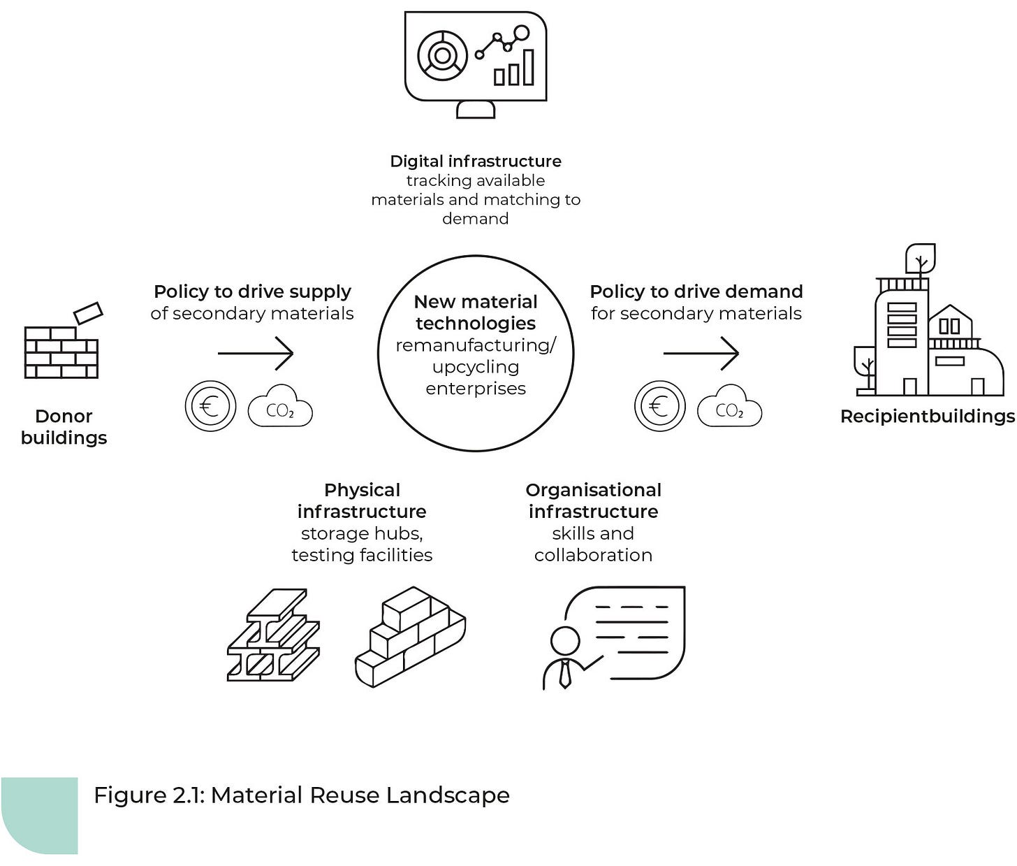 Policy change, procurement-power, and the investment in infrastructure to support a shift to materials re-use are also needed, as illustrated here: