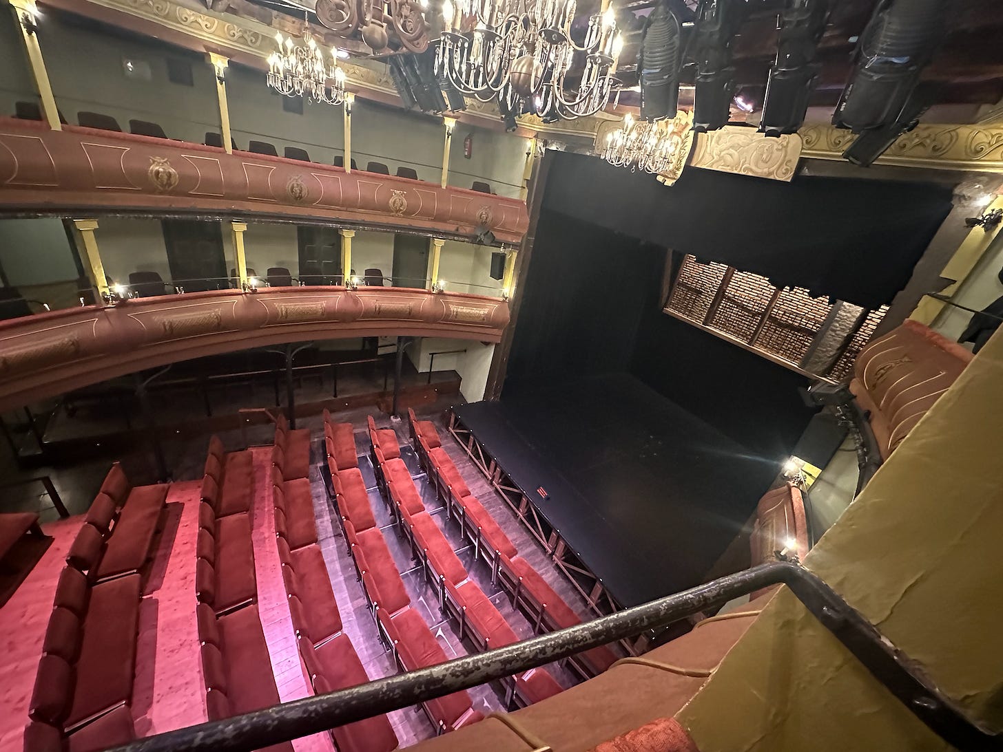 We returned to the theater for that evening’s performance. (We had booked late, so were seated to one side, meaning that my view was partially obscured by a beam which at first annoyed me until I realized that was just right, a reminder of the structure that was holding us together to share this slice of time, just as it had many audiences past).